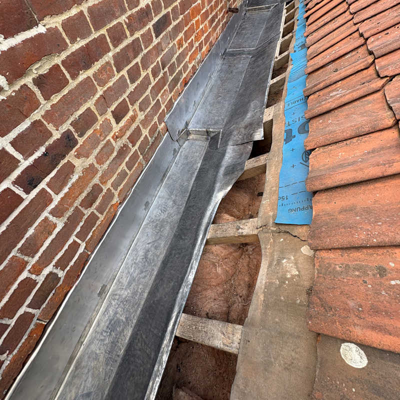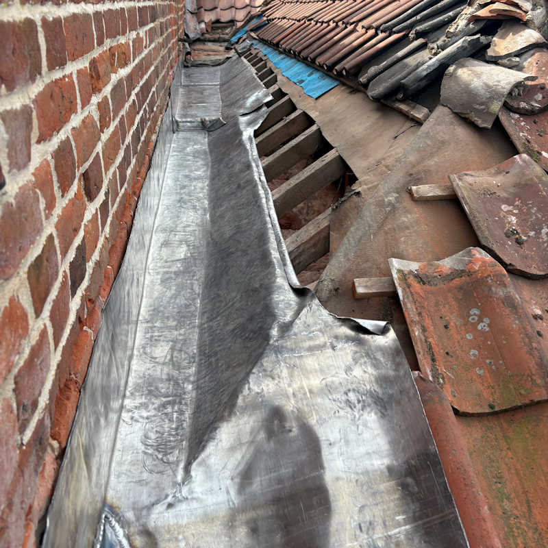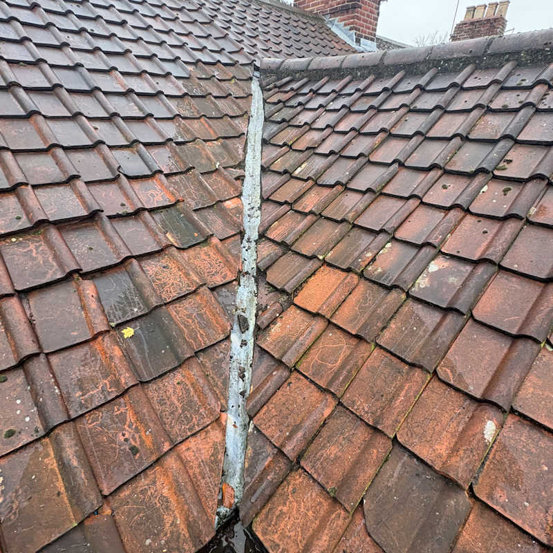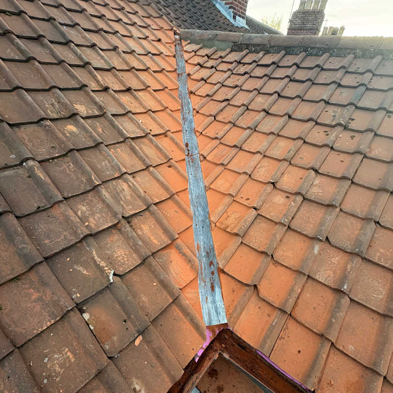Over time, leadwork and flashings can deteriorate, allowing water ingress. The remedy is to remove existing lead and replace it with new appropriately coded lead, re-pointing and re-tiling as required.